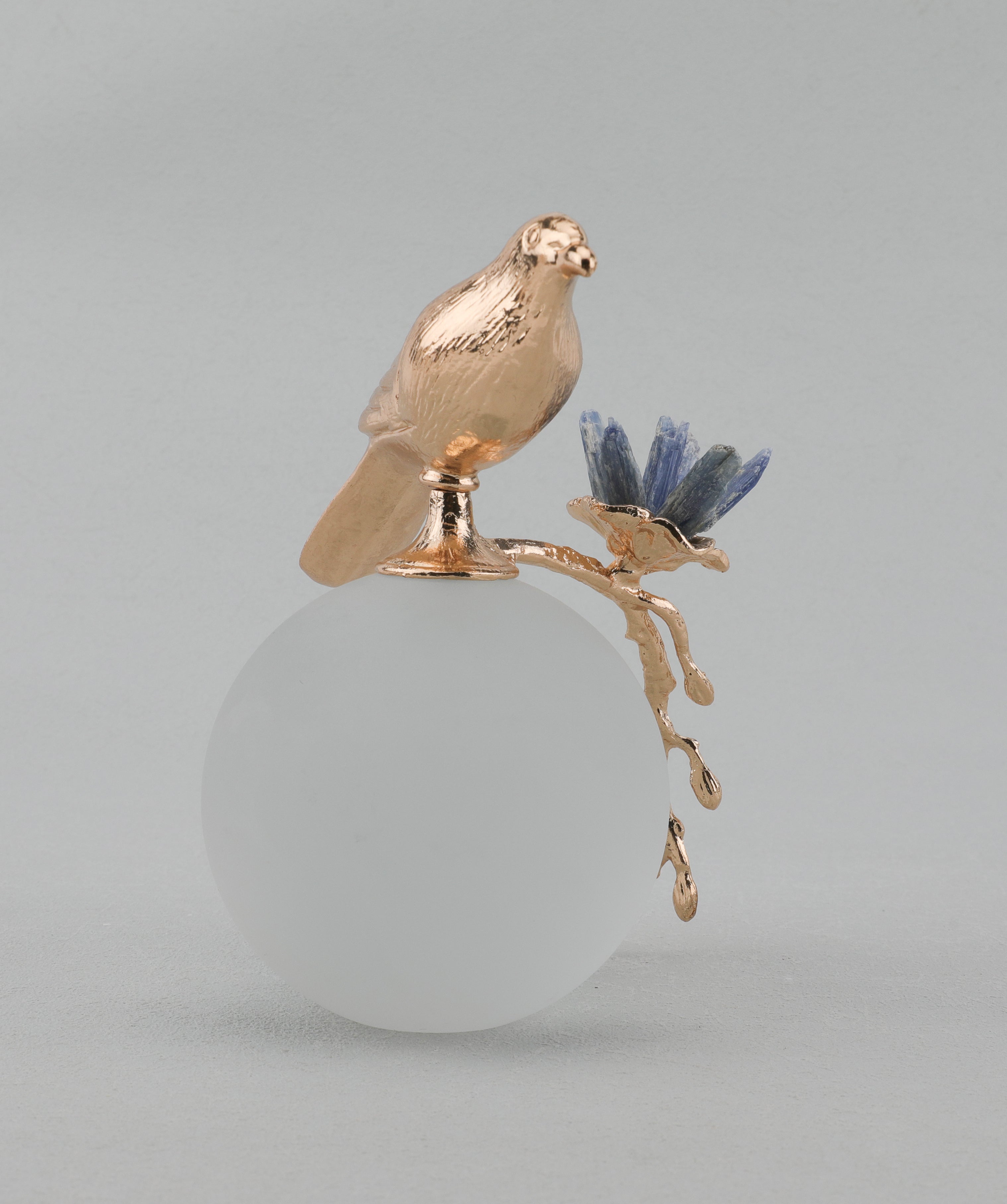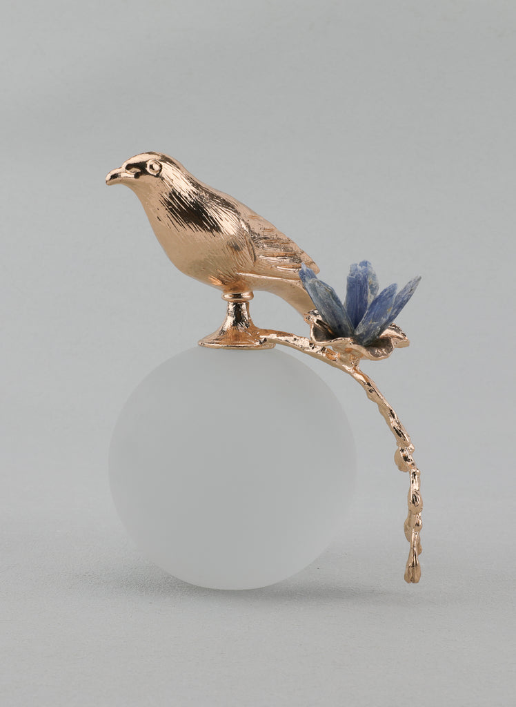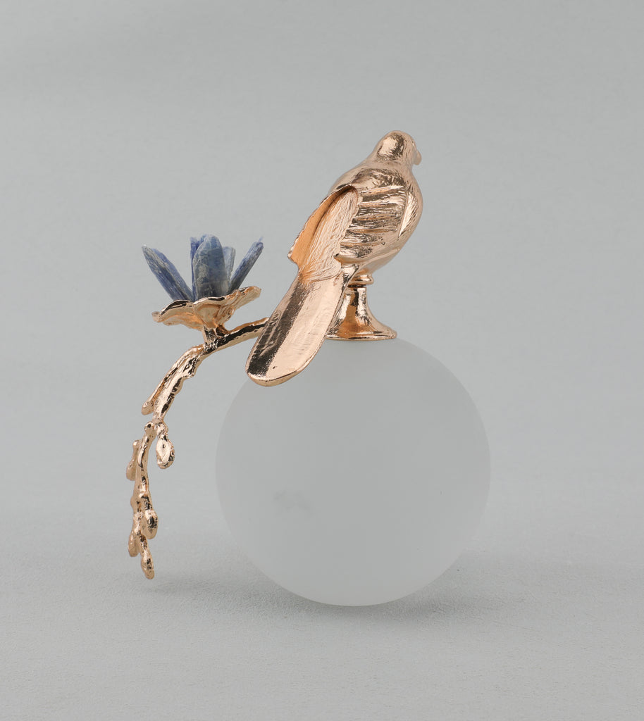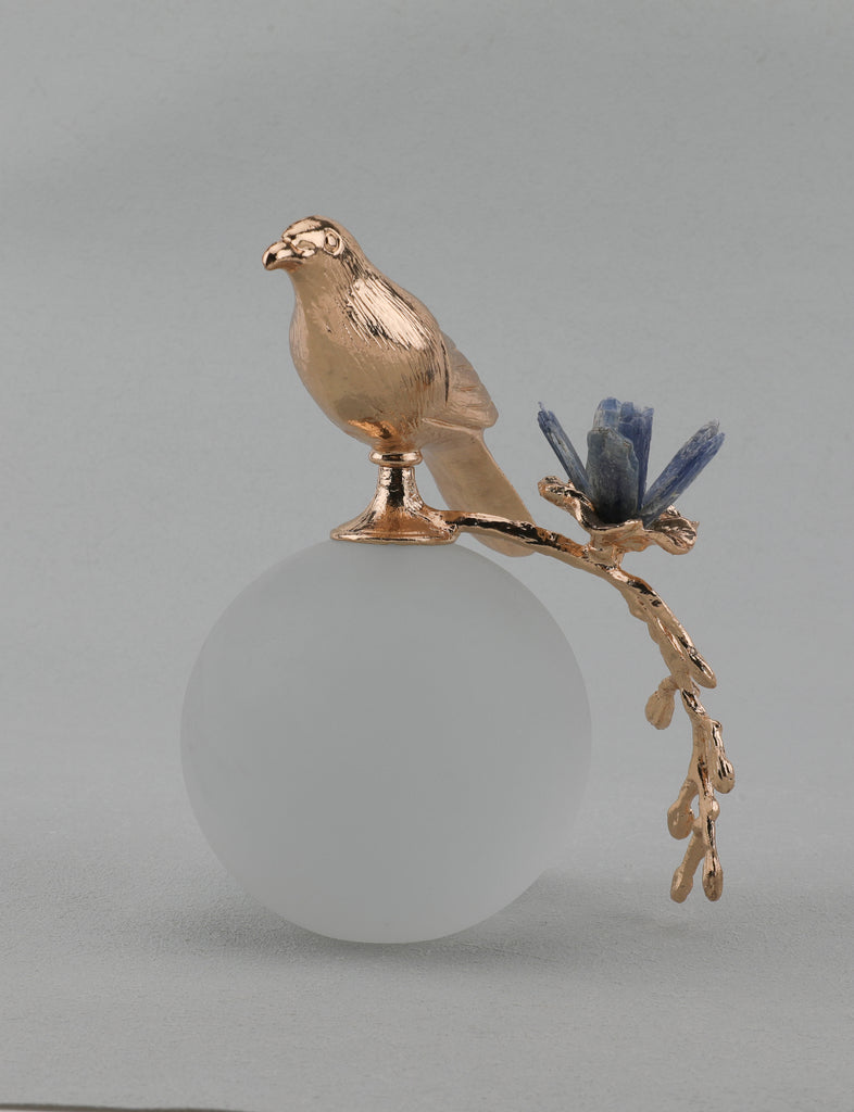 Stunning sculpture featuring a gold-toned metal tree branch adorned with amethyst and quartz gemstones, with a bird perched elegantly upon it. Crafted with fine detail and mounted on a rich green marble base. A harmonious blend of nature's beauty and artistic expression. Perfect for adding a touch of sophistication and charm to any decor.