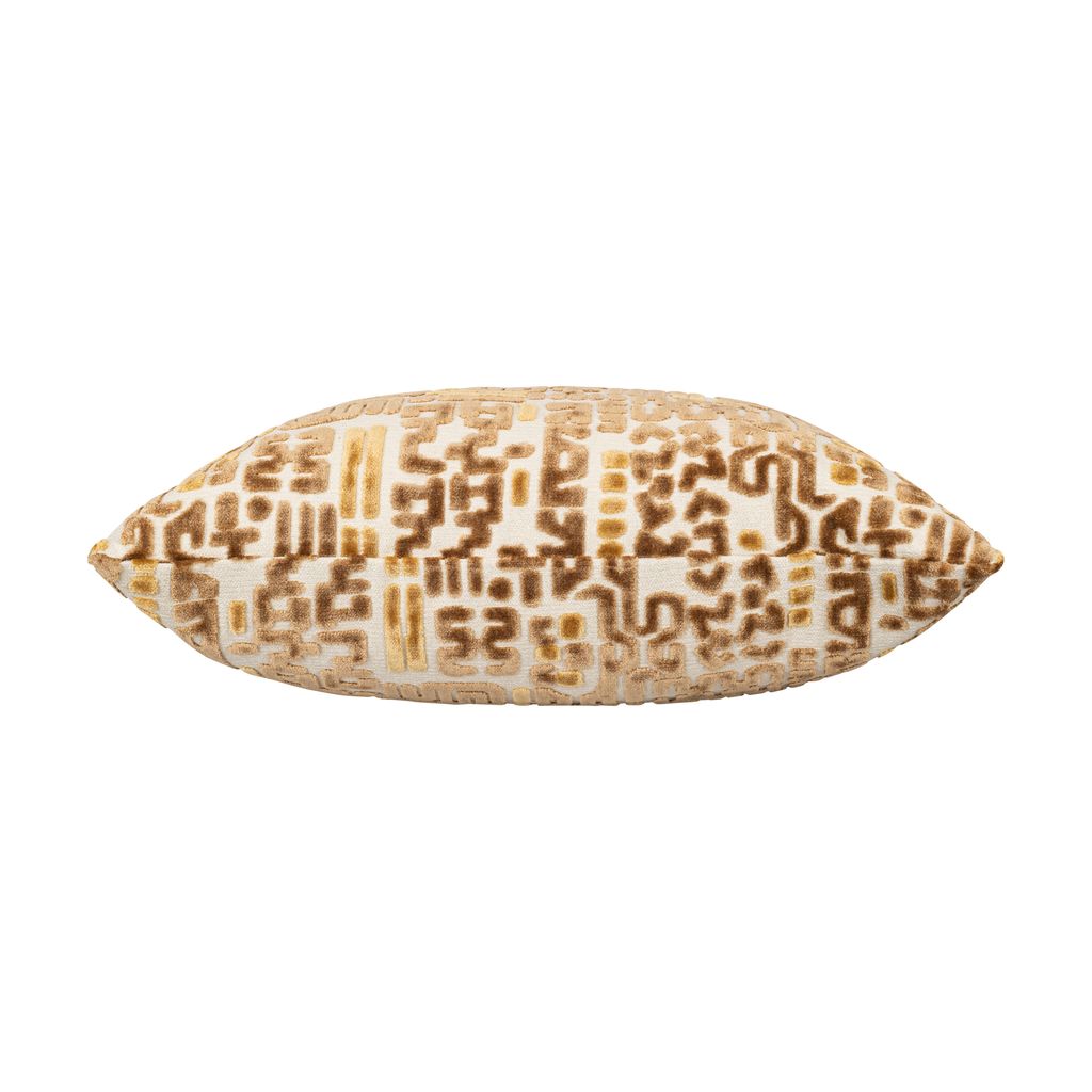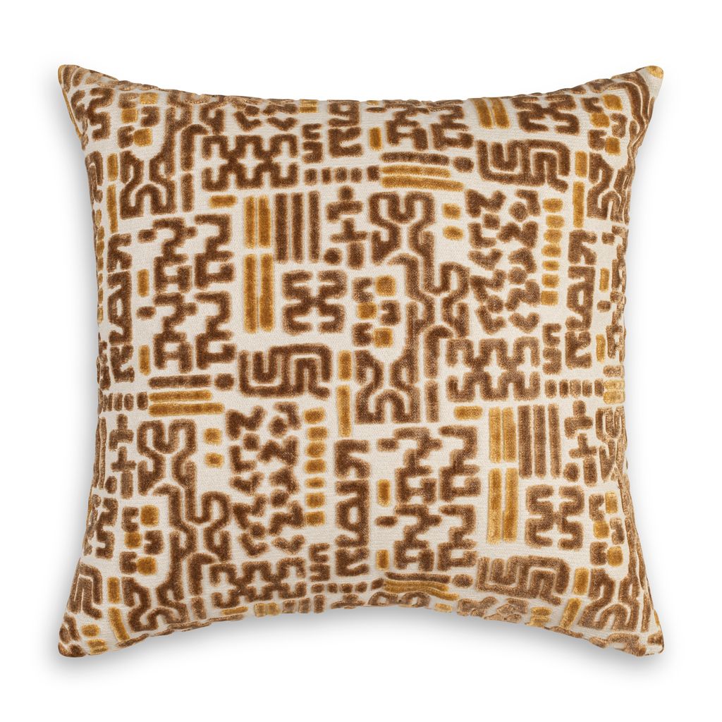 Add a touch of boho chic to your space with this unique pillow featuring an abstract pattern of mustard and tan shapes on a cream background. The design resembles a playful mix of geometric lines and squiggles, creating a visually interesting texture.