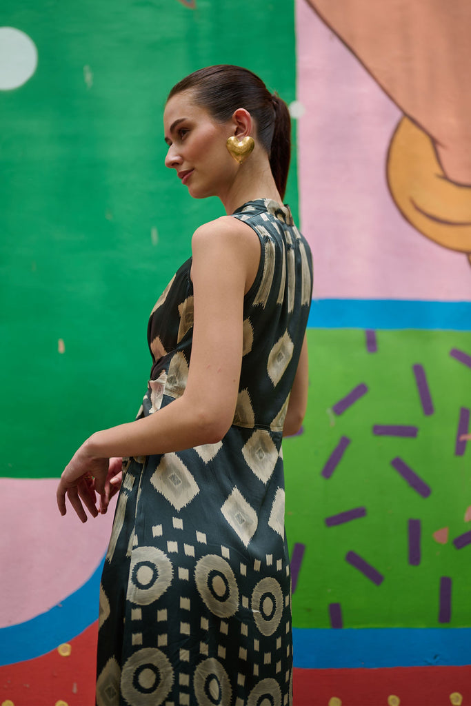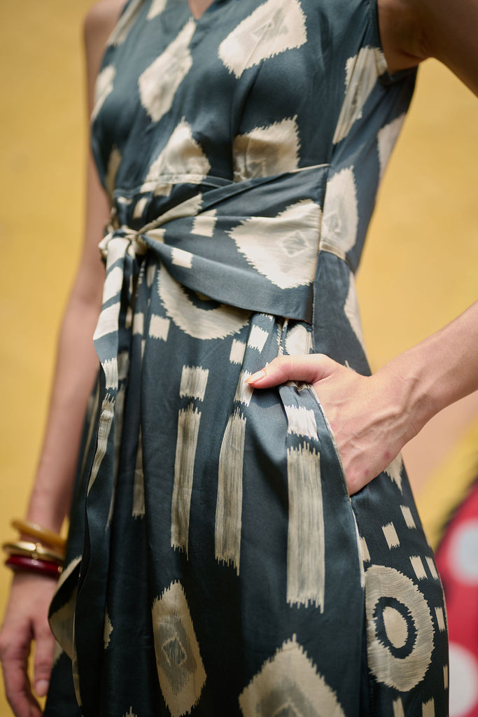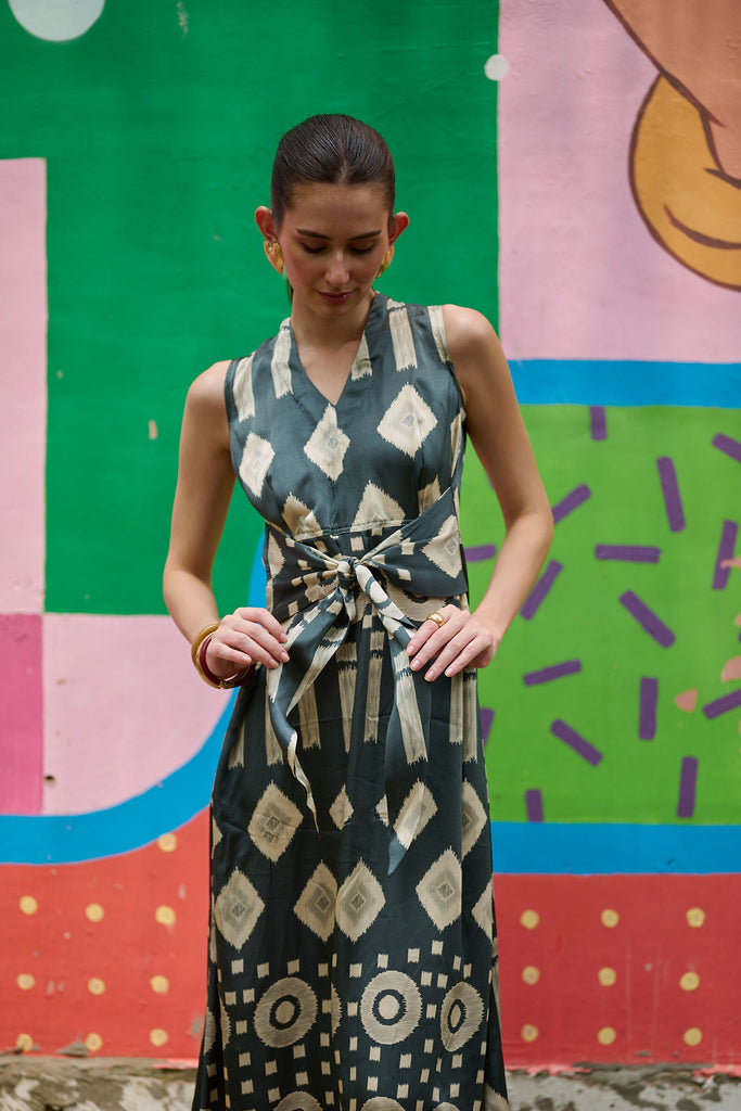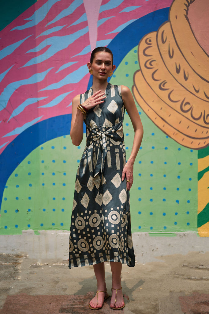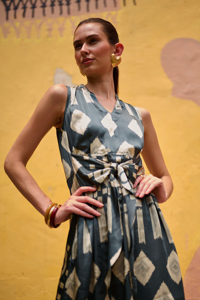A sleeveless midi crafted in luxurious flowing bamber satin, featuring our hand-illustrated Eclipse Ikat print in earthy tones on a charcoal base. Designed with a V-neckline and a tie-knot belt that can be styled front or back, this ankle-grazing dress is an effortless classic for day-to-night wear.